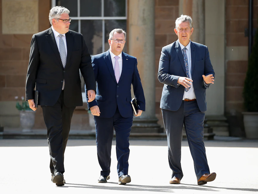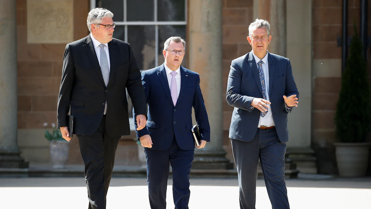 زعيم الحزب الوحدوي الديمقراطي السير جيفري دونالدسون (وسط) مع عضوين بالحزب بعد اجتماع عقد مع رئيس الوزراء البريطاني السابق بوريس جونسون في إيرلندا الشمالية. 16 مايو 2022 - REUTERS