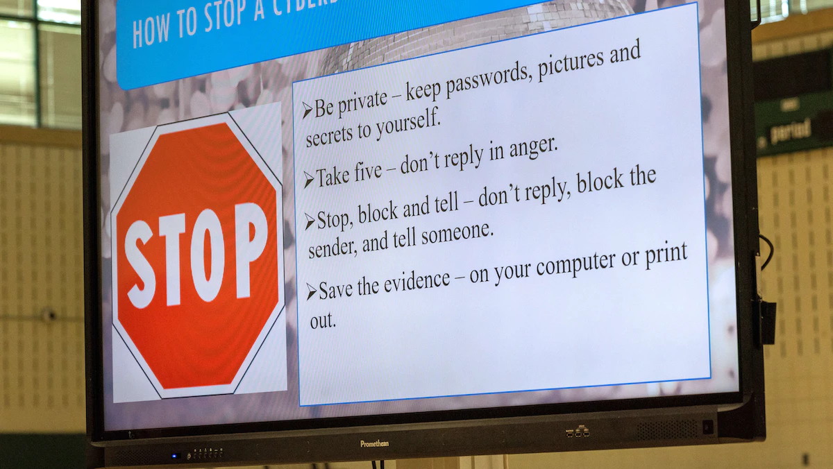 محاضرة عن أمن الإنترنت والتنمر عبر الإنترنت تنظمها الشرطة لطلاب المرحلة الإعدادية في مدينة ستامفورد بولاية تكساس الأميركية. 24 أكتوبر 2022 - AFP