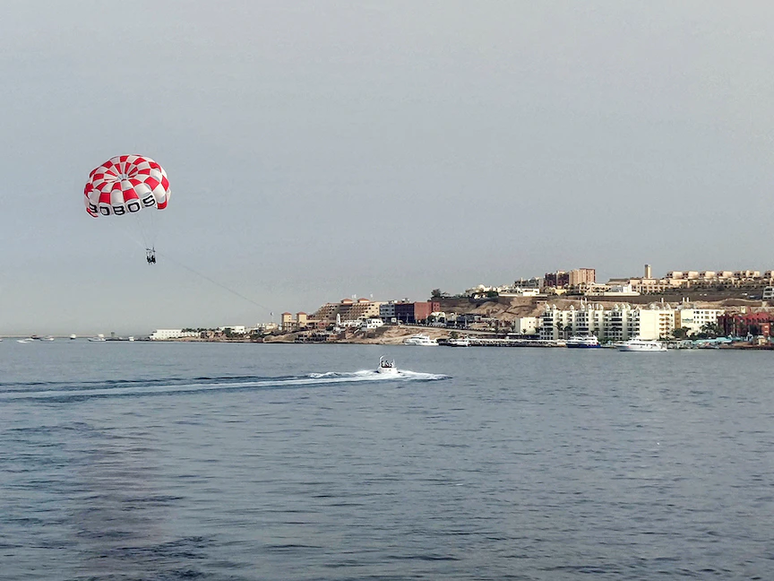 سائحون يستخدمون منطاداً مخصص للألعاب المائية في مياه البحر الأحمر قبالة منتجع بمدينة الغردقة في مصر. 8 يونيو 2023 - AFP