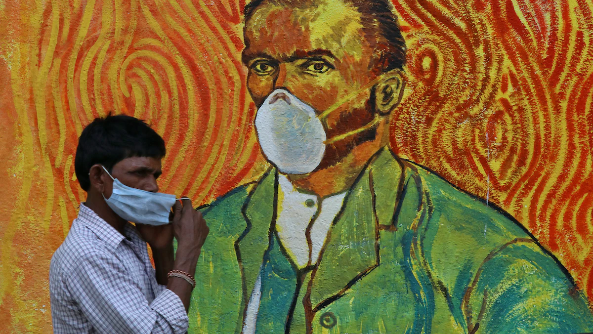 رجل يعدل قناع وجهه وهو يمشي أمام لوحة جدارية وسط انتشار فيروس كورونا في مومباي بالهند. 11 مارس 2021 - REUTERS