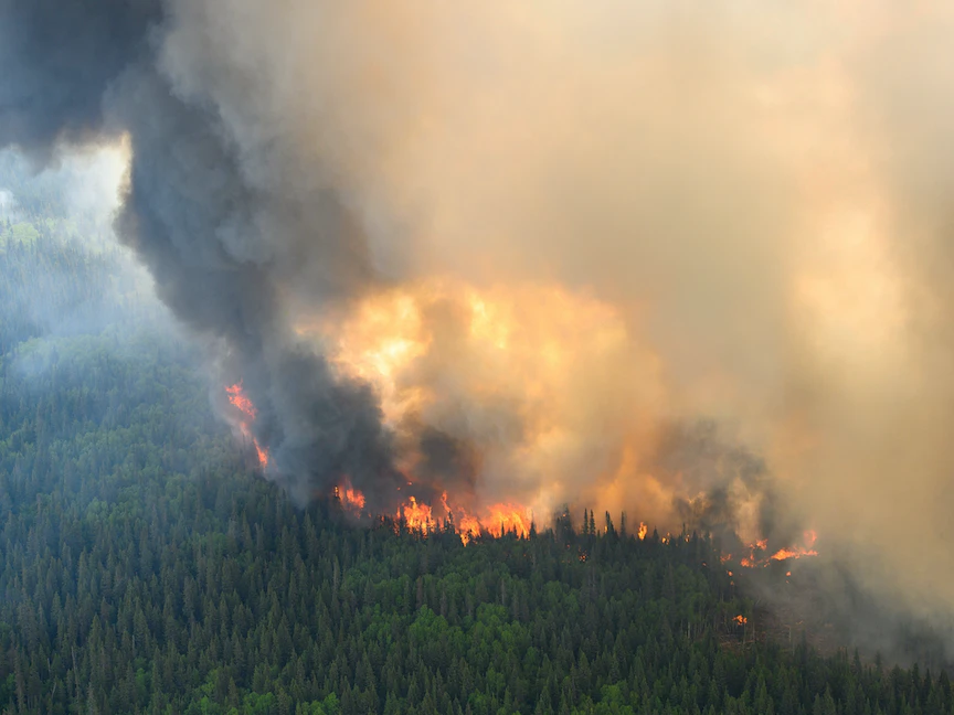 حريق هائل كما شوهد من مروحية تابعة للقوات الكندية تقوم بمسح المنطقة بالقرب من ميستيسيني، كيبيك، كندا. 12 يونيو 2023 - REUTERS