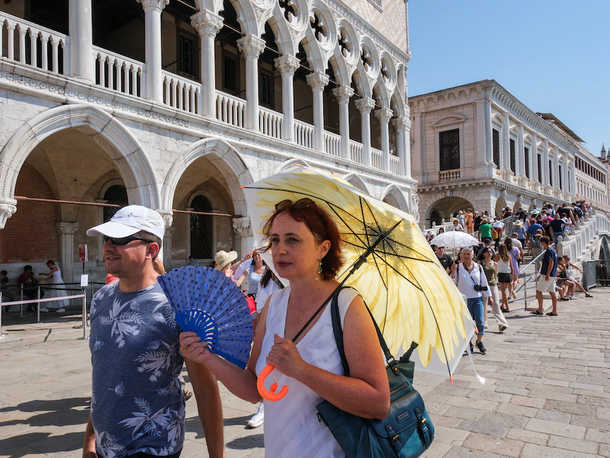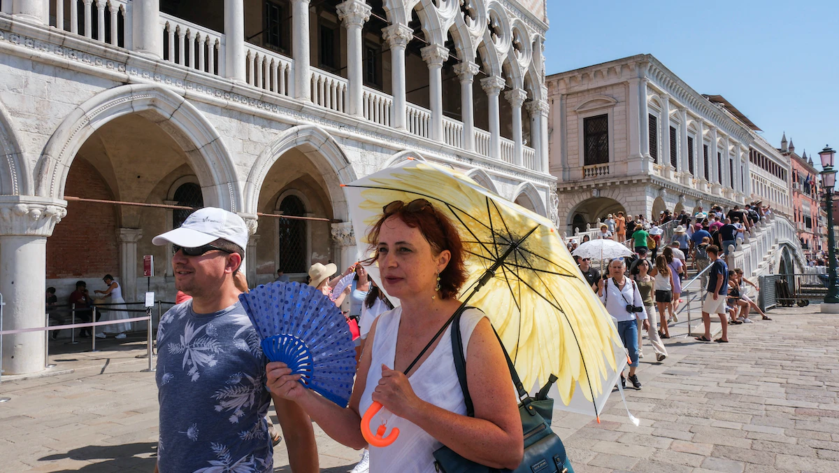 سياح يحتمون من الشمس في ساحة سان مارك بفينيسيا في إيطاليا. 16 يوليو 2023 - REUTERS