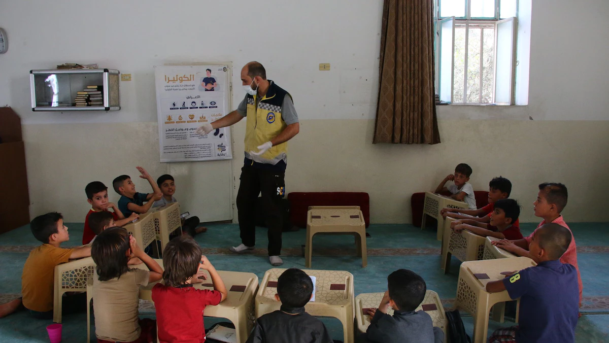 أحد أفراد الدفاع المدني السوري "الخوذ البيضاء" يعمل على توعية الأطفال بشأن مرض الكوليرا. 21 يوليو 2023 - twitter/SyriaCivilDefe