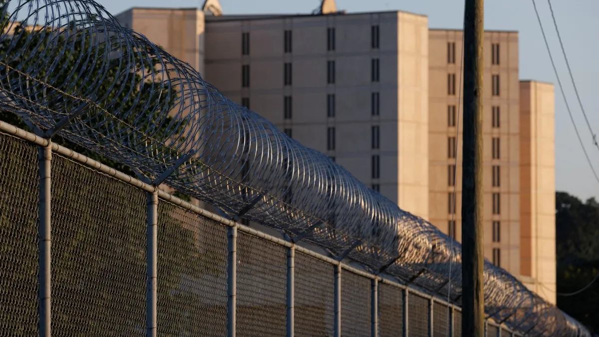 أسلاك شائكة خارج سجن مقاطعة فولتون بولاية جورجيا الأميركية. 18 أغسطس 2023 - REUTERS
