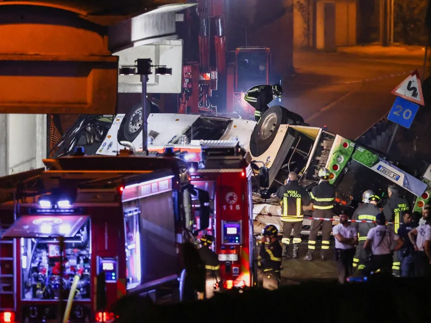 وانحرفت الحافلة عن الطريق وسقطت بالقرب من خطوط للسكك الحديد في منطقة ميستري، التي يربطها جسر بمدينة فينيسيا الواقعة في شمال إيطاليا، فيما لم يتضح سبب الحادث.