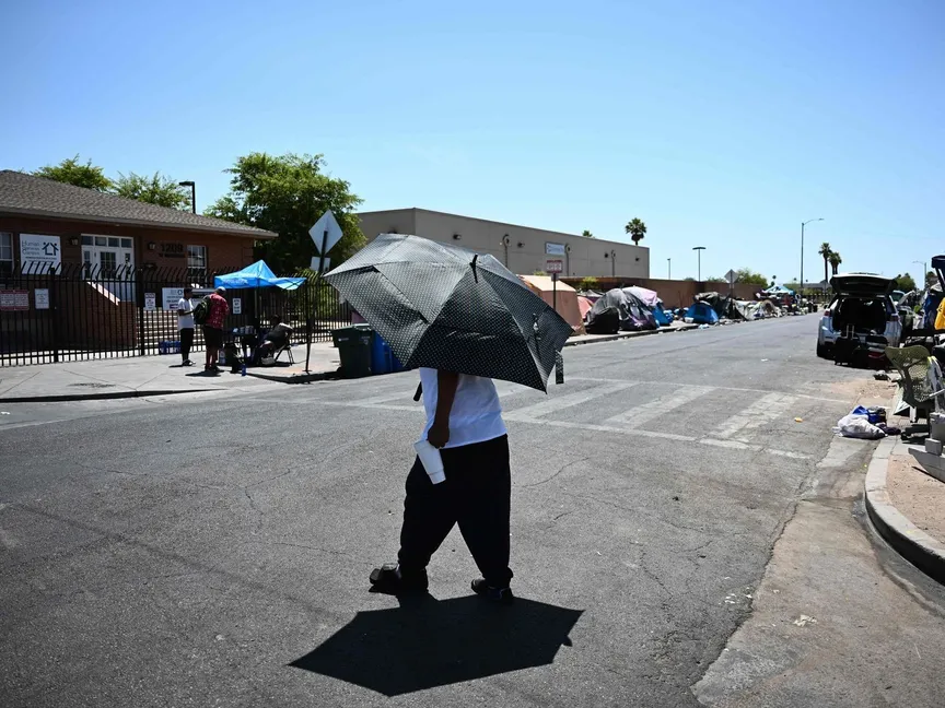 رجل يحتمي من حرارة الشمس بمظلة في ولاية أريزونا الأميركية. 18 يوليو 2023 - AFP