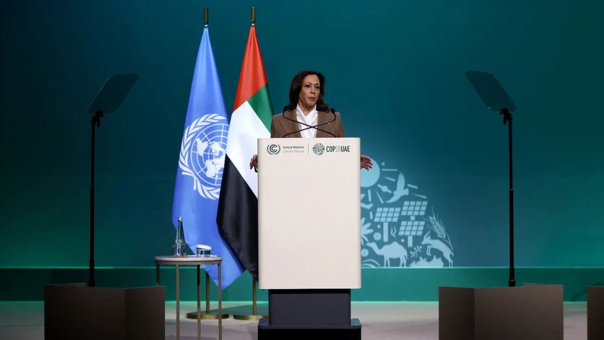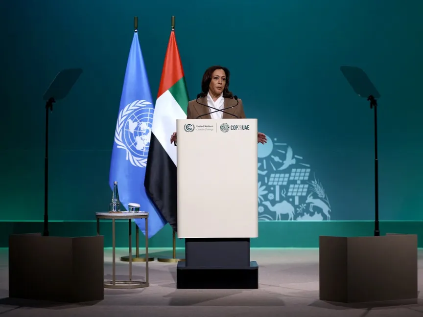نائبة الرئيس الأميركي كامالا هاريس تتحدث خلال مؤتمر الأمم المتحدة لتغير المناخ COP 28 في دبي بالإمارات. 2 ديسمبر 2023 - REUTERS