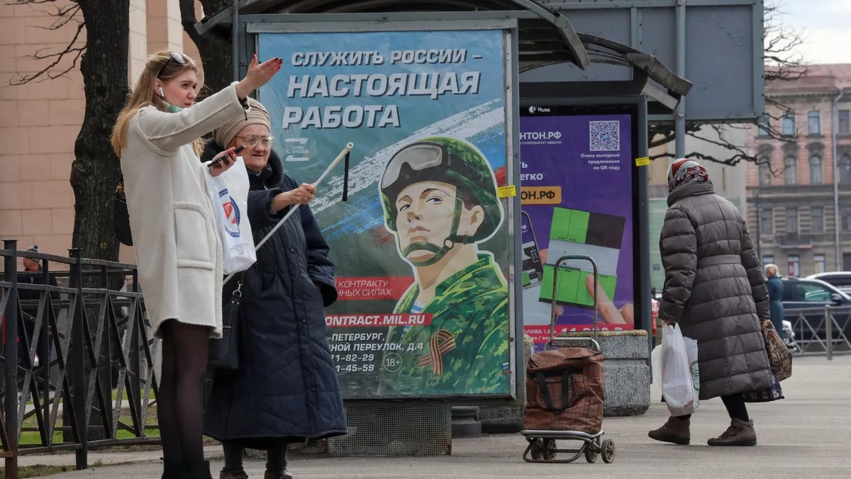 لوحة إعلانية بمحطة حافلات في سانت بطرسبرج بروسيا تحمل شعار 'خدمة روسيا هي المهمة الحقيقية' وتروج للخدمة في الجيش الروسي. 20 أبريل 2023 - Reuters