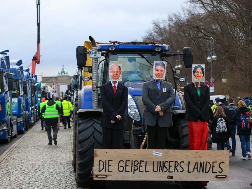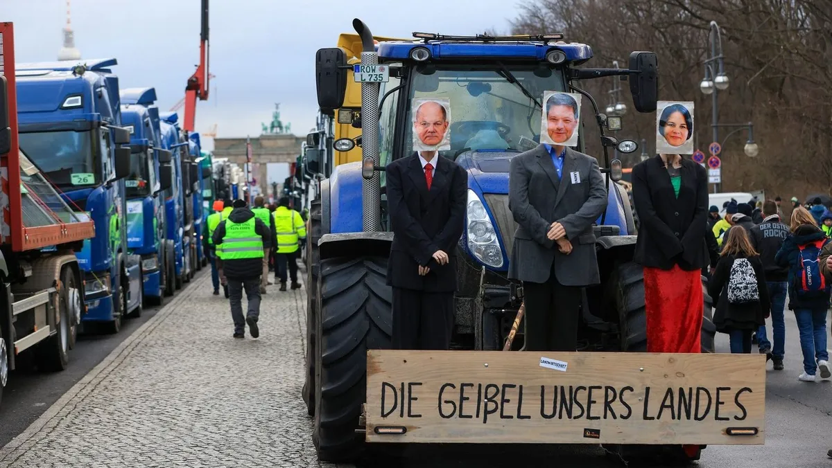 أغلق آلاف المزارعين الألمان بجراراتهم وسط العاصمة الألمانية برلين، الاثنين، احتجاجاً على خطط إلغاء مزاياهم الضريبية، ودعوا إلى استقالة حكومة أولاف شولتز، فيما تشهد البلاد موجة احتجاجات واسعة؛ بسبب ارتفاع الأسعار.