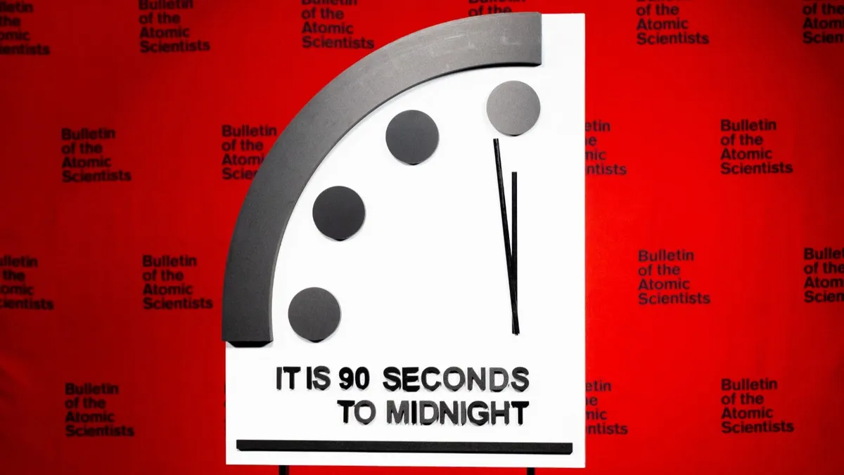 أبقت مجموعة من علماء الذرة، التي تدير "ساعة يوم القيامة" في واشنطن، توقيت الساعة عند منتصف الليل إلا تسعين ثانية، بمعنى أن البشرية لم تكن يوماً أقرب إلى نهاية العالم مثلما هي عليه اليوم، وذلك بسبب إسرائيل المسلحة نووياً، والتي تشن حرباً على غزة، و"تهديدات روسيا النووية" في أوكرانيا، بالإضافة إلى التغير المناخي.