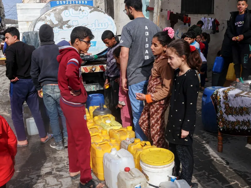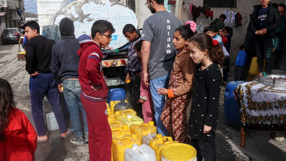 أطفال فلسطينيون يصطفون للحصول على المياه في رفح جنوبي قطاع غزة بينما تفرض إسرائيل حصاراً خانقاً على القطاع. 17 مارس 2024 - AFP