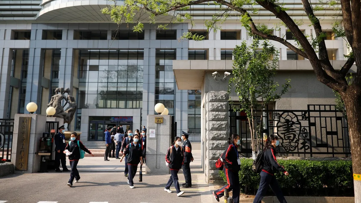 طلاب خارج مدرسة في بكين. 27 أبريل 2020 - Reuters