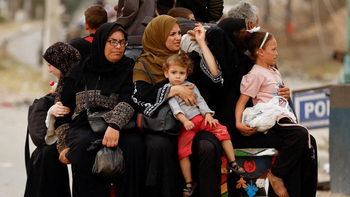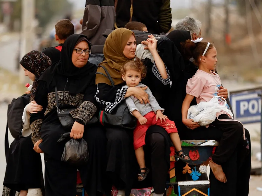 فلسطينيون فارون من شمال غزة يركبون في الجزء الخلفي من شاحنة أثناء تحركهم جنوباً وسط حرب إسرائيل على غزة. 12 نوفمبر 2023. - Reuters