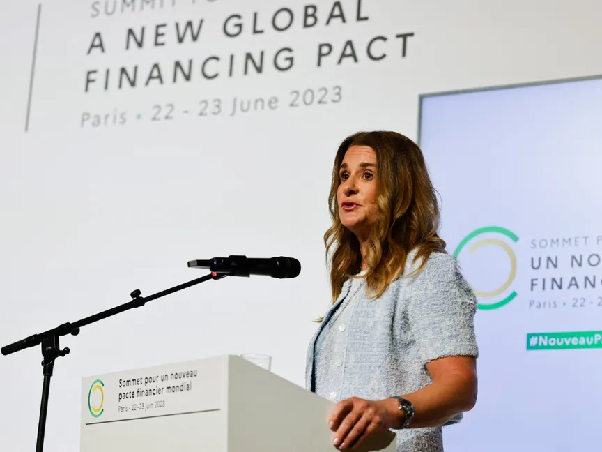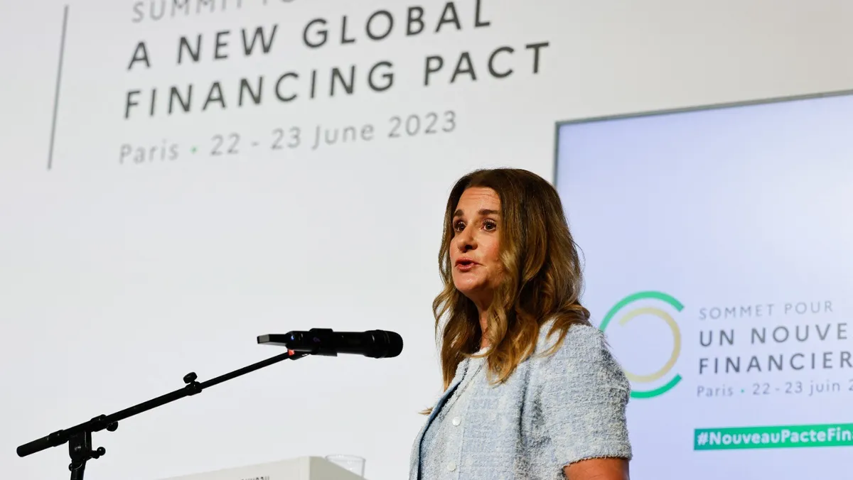 ميليندا جيتس أثناء خطاب لها في قمة "ميثاق مالي عالمي جديد"، باريس، فرنسا، 22 يونيو 2023. - AFP