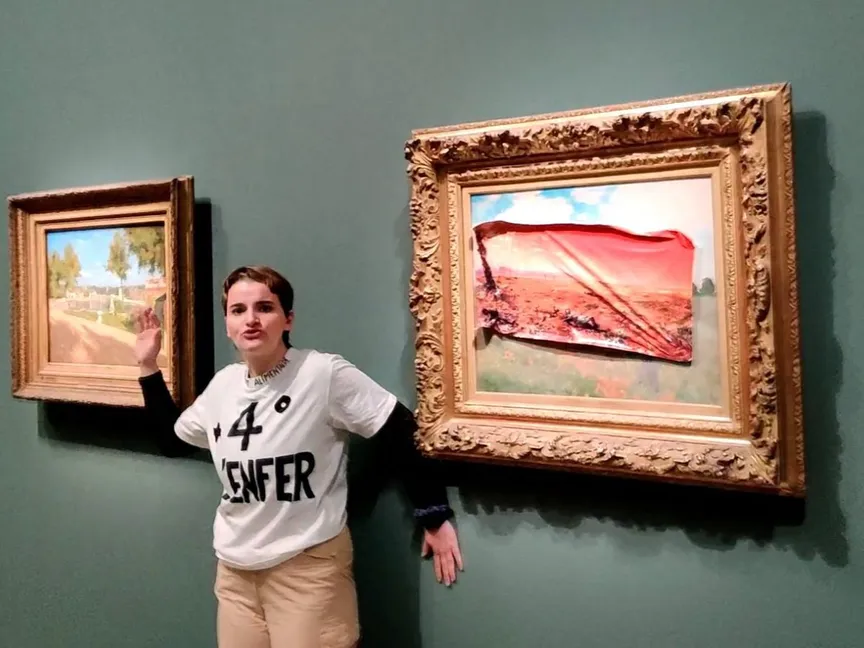 وأظهر مقطع فيديو انتشر عبر منصة "إكس" امرأة، وهي عضو في مجموعة "ريبوست أليمانتير" Riposte Alimentaire التي تضم ناشطين بيئيين ومدافعين عن الإنتاج الغذائي المستدام، تضع ملصقاً باللون الأحمر على لوحة "شقائق النعمان" للرسام الفرنسي كلود مونيه.