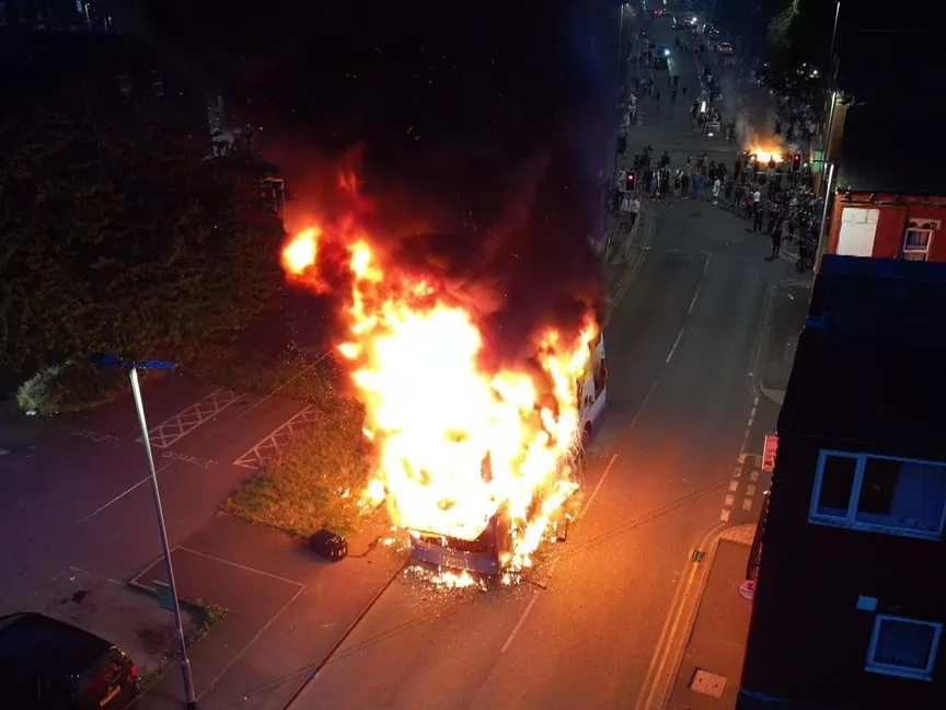 حافلة تحترق بمنطقة هيرهيلز في مدينة ليدز البريطانية. 18 يوليو 2024 - news.sky.com