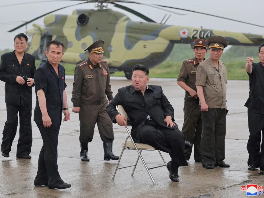 زعيم كوريا الشمالية كيم جونج أون يراقب جهود الإنقاذ في مناطق غمرتها مياه الفيضانات في مقاطعة بيونجان الشمالية قرب الحدود مع الصين. 28 يوليو 2024 - REUTERS
