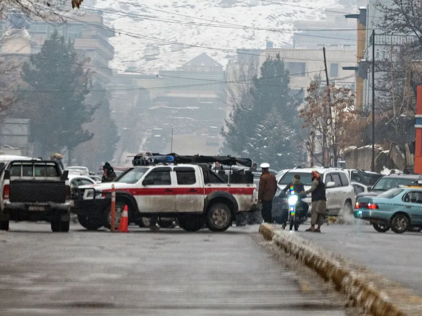 قوات الأمن التابعة لحركة طالبان تغلق طريقاً بعد تفجير انتحاري قرب وزارة الخارجية في العاصمة الأفغانية كابول. 11 يناير 2023 - AFP