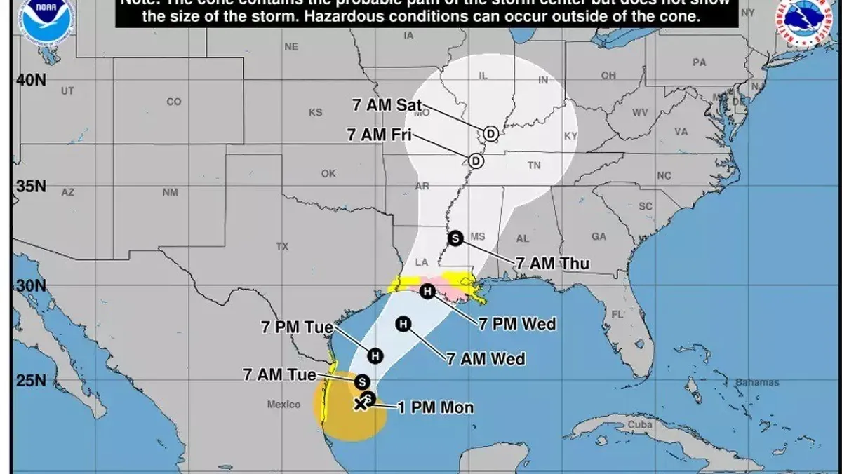 وسيؤدي ذلك على الأرجح إلى هبوب عاصفة تهدد حياة الموجودين في المناطق العليا من ساحلي تكساس ولويزيانا، وكذلك رياح بقوة الإعصار على جنوب لويزيانا، هذا الأسبوع.