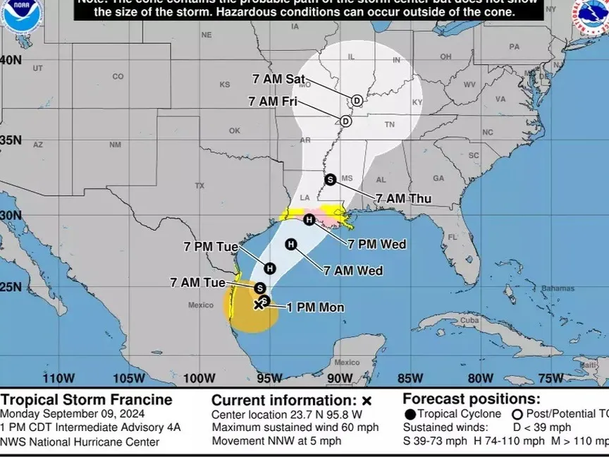 المسار المتوقع للعاصفة الاستوائية "فرانسين" التي تقترب من ساحل خليج لويزيانا في خليج المكسيك، بحسب المركز الوطني للأعاصير، الولايات المتحدة. 9 سبتمبر 2024 - houstonchronicle