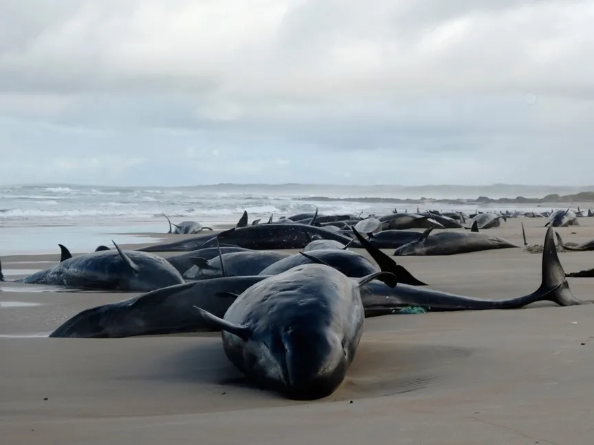 دلافين جانحة قرب نهر آرثر، على بعد حوالي 400 كيلومتر من هوبرت، عاصمة ولاية تسمانيا، أستراليا، 19 فبراير 2025 - AP