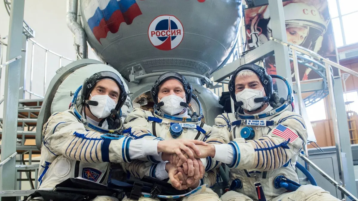 رواد فضاء من وكالة الفضاء الروسية ووكالة الفضاء الأميركية (ناسا) يقفون لالتقاط صورة خلال جلسة تدريبية قبل بعثتهم إلى محطة الفضاء الدولية في ستار سيتي- 20 مارس 2021. - REUTERS