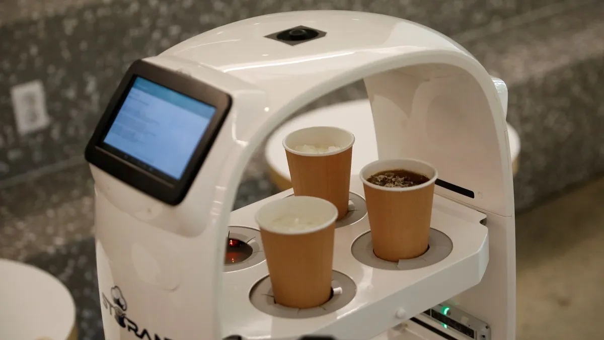 ويستلم كل زبون مشروبه على صينية مثبتة في الروبوت الأبيض الكبير اللامع، بعد نحو دقيقة فقط من طلبه.