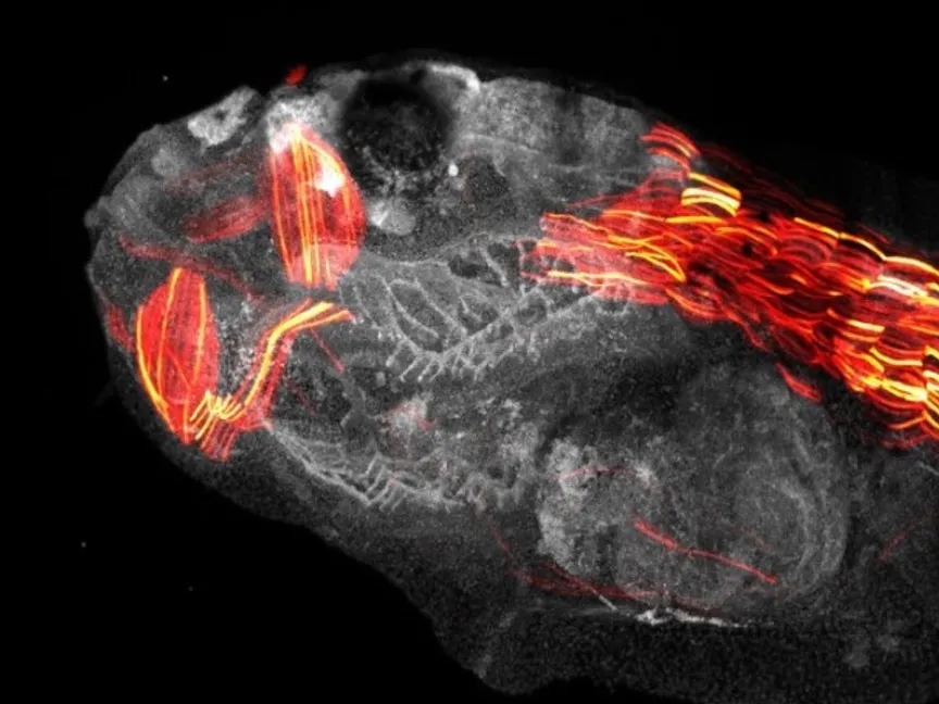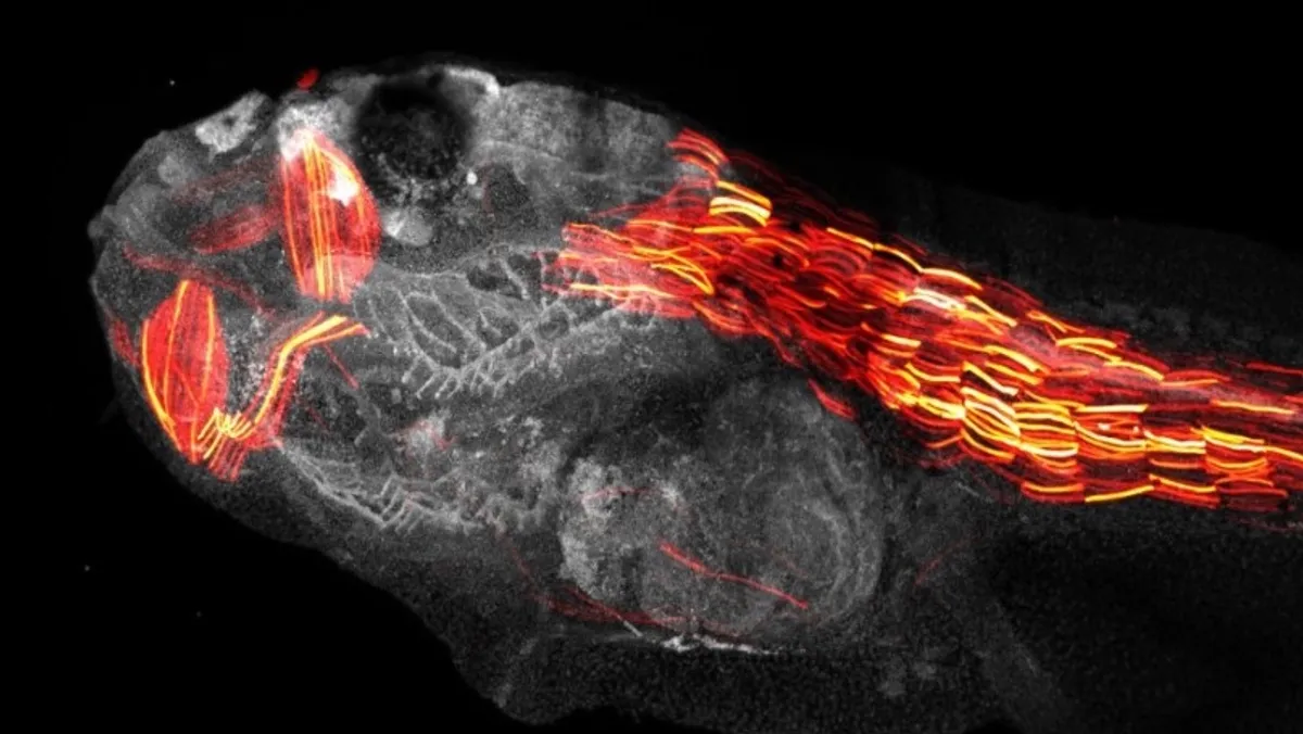 تصوير ثلاثي الأبعاد لإنتاج بروتين أحمر فلوري في ضفدع باستخدام تقنية جديدة لتعديل الجينات - https://www.news.uzh.ch/en/articles/media/2025/AI-genome-editing.html