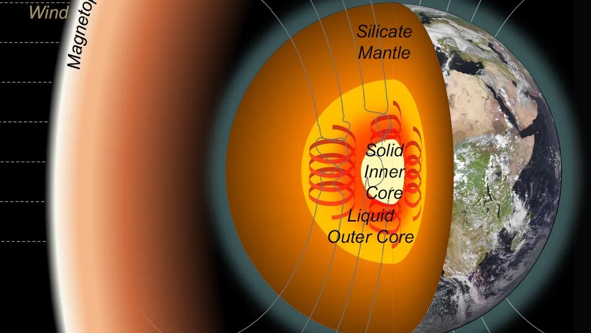 واللب الداخلي لقلب الأرض غني بالحديد، ويحيط به لب خارجي منصهر، ومع مرور ملايين السنين، يبرد اللب الخارجي ويتجمد تدريجياً، ما يؤدي إلى نمو اللب الداخلي الصلب، وتمثل هذه العملية "المولد الجيوديناميكي" وهي العملية الطبيعية التي تولد المجال المغناطيسي للأرض في أعماقها.
