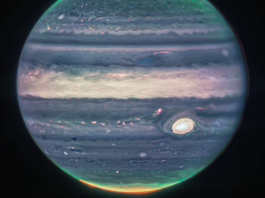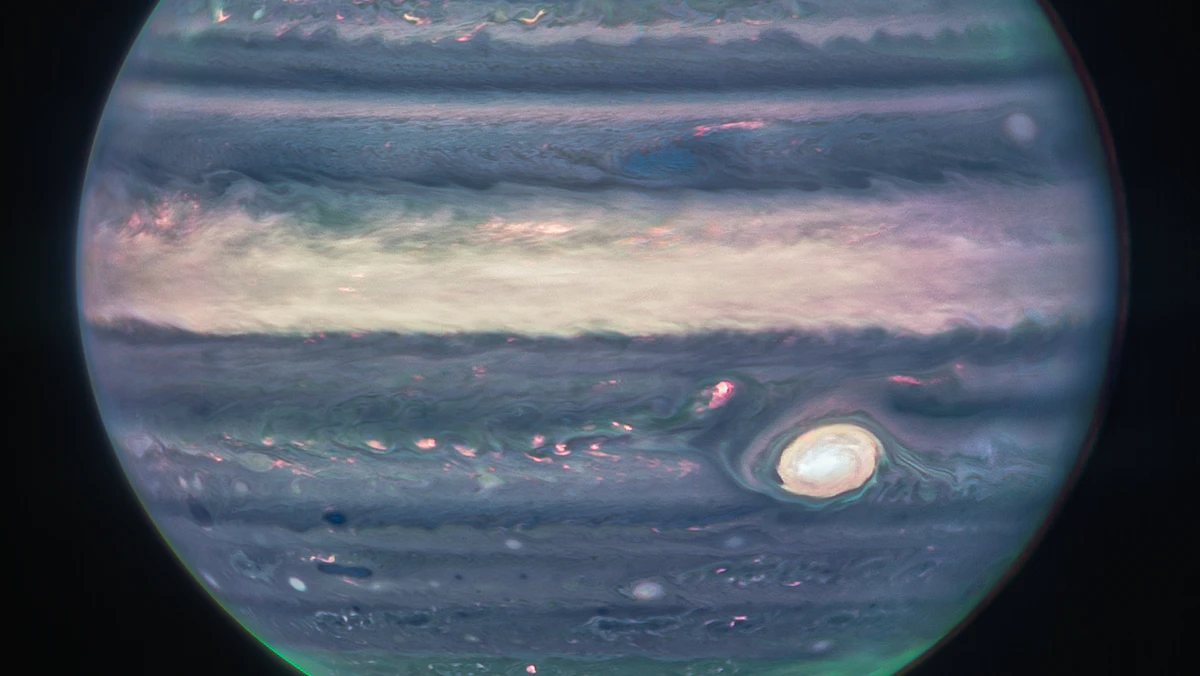 نشرت وكالة الفضاء الأميركية (ناسا) صوراً جديدة لكوكب المشترى وفرها التلسكوب الفضائي جيمس ويب، ويظهر فيها قمران صغيران وحلقات مشوشة وقطبان متوهجان.
