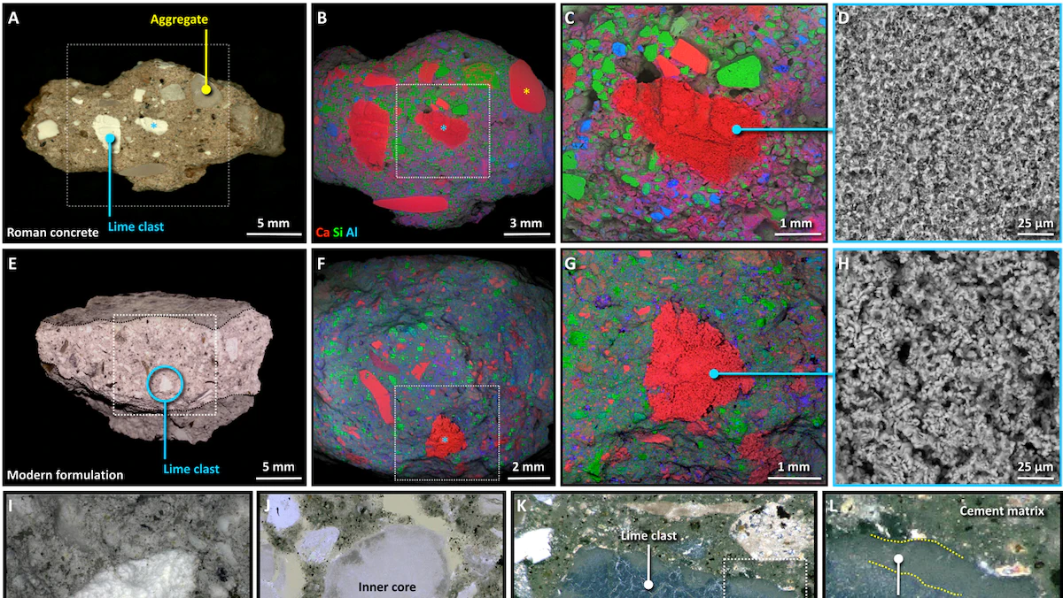 وأظهر الفحص المجهري الدقيق بحسب الدراسة، أن هذه العينات القديمة تحتوي أيضاً على سمات معدنية بيضاء ساطعة صغيرة ومميزة بمقياس ملليمتر، لوحظت منذ فترة طويلة كمكون في كل مكان من الخرسانة الرومانية.