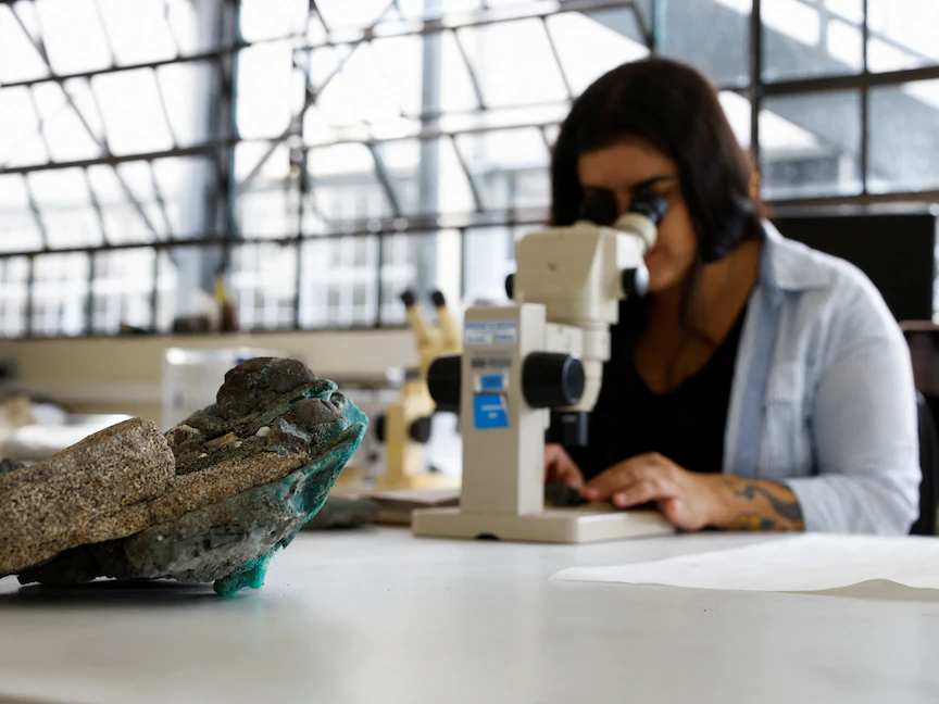 باحثة تنظر من خلال مجهر في "الصخور البلاستيكية"، التي عثر عليها في جزيرة ترينداد في ولاية إسبيريتو سانتو ، في مختبر جامعة بارانا الفيدرالية، البرازيل. 7 مارس 2023 - REUTERS