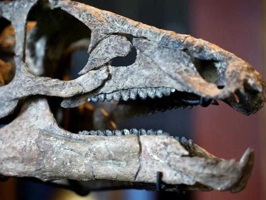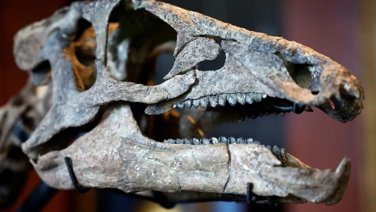 هيكل عظمي لديناصور عاش قبل حوالي 150 مليون سنة خلال مزاد في باريس. 7 سبتمبر 2022 - Reuters