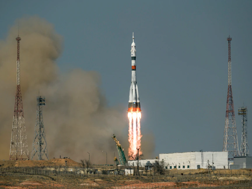 و انطلق الرواد، الثلاثة من قاعدة بايكونور، تماماً مثل غاغارين، لكن من منصة إطلاق مغايرة، بسبب خضوع المنصة التي انطلق منها الرائد السوفياتي إلى عمليات تعديل تستمر حتى 2023، لتتمكن من استقبال الجيل الجديد من صواريخ سويوز.
