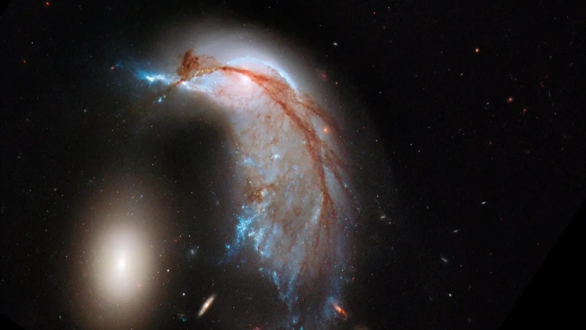 وتُعرف المجرتان المختلطتان معا باسم "أرب 142". وتظهر في الصور وسط ضباب عبارة عن مزيج من النجوم والغاز في غمرة اندماجهما البطيء.