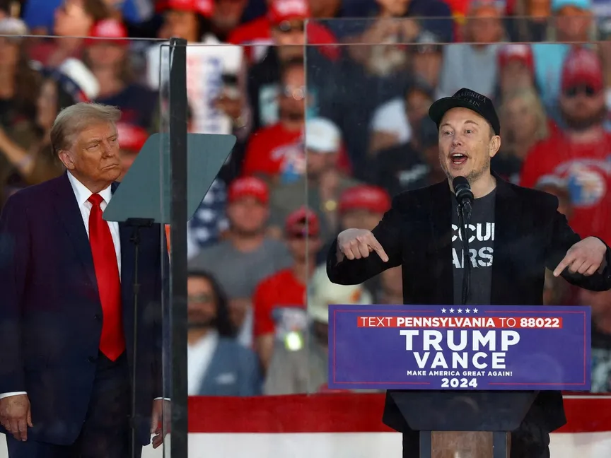 مالك منصة إكس إيلون ماسك يتحدث بجانب الرئيس الأميركي السابق دونالد ترمب خلال تجمع انتخابي في بتلر بولاية بنسلفانيا. 5 أكتوبر 2024 - REUTERS
