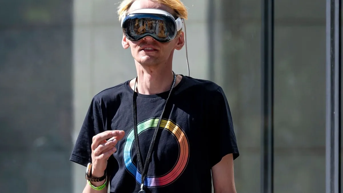 أحد الحضور يرتدي نظارة الواقع المختلط (XR) "Apple Vision Pro" خلال فعاليات مؤتمر المطورين العالمي لشركة أبل الذي أُقيم في مقر الشركة في كوبرتينو بولاية كاليفورنيا. 10 أبريل 2024 - Bloomberg