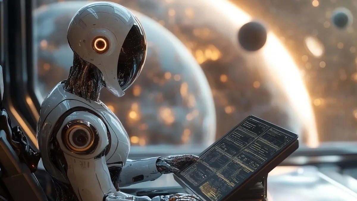 صورة أنتجتها "الشرق" بالذكاء الاصطناعي لروبوت يحلل البيانات تتعلق بكوكب آخر. 22 مايو 2025 - Midjourney