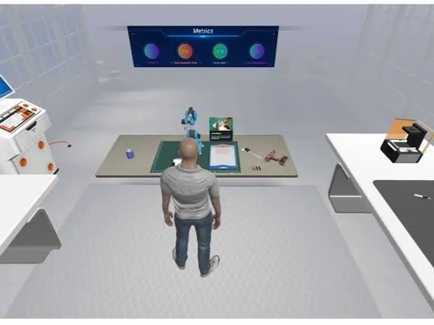 عند ارتداء نظارات الواقع الافتراضي، يجد المتدرب نفسه داخل محطة عمل افتراضية مصممة بدقة لتُماثل بيئة المصنع، حيث تتوفر جميع الأدوات اللازمة لتفكيك جهاز مثل قرص صلب، إلى جانب ذراع روبوتية تعمل بالتوازي بجوار المتدرب.