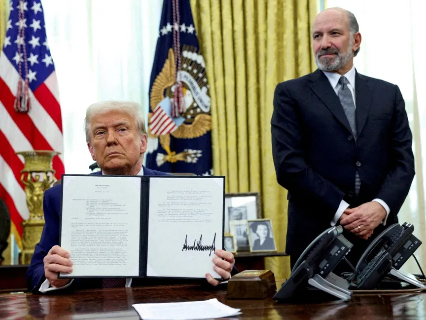 الرئيس الأميركي دونالد ترمب يحمل أمراً تنفيذياً بشأن زيادة التعريفات الجمركية وإلى جواره وزير التجارة الأميركي هوارد لوتنيك في المكتب البيضاوي. 13 فبراير 2025 - REUTERS