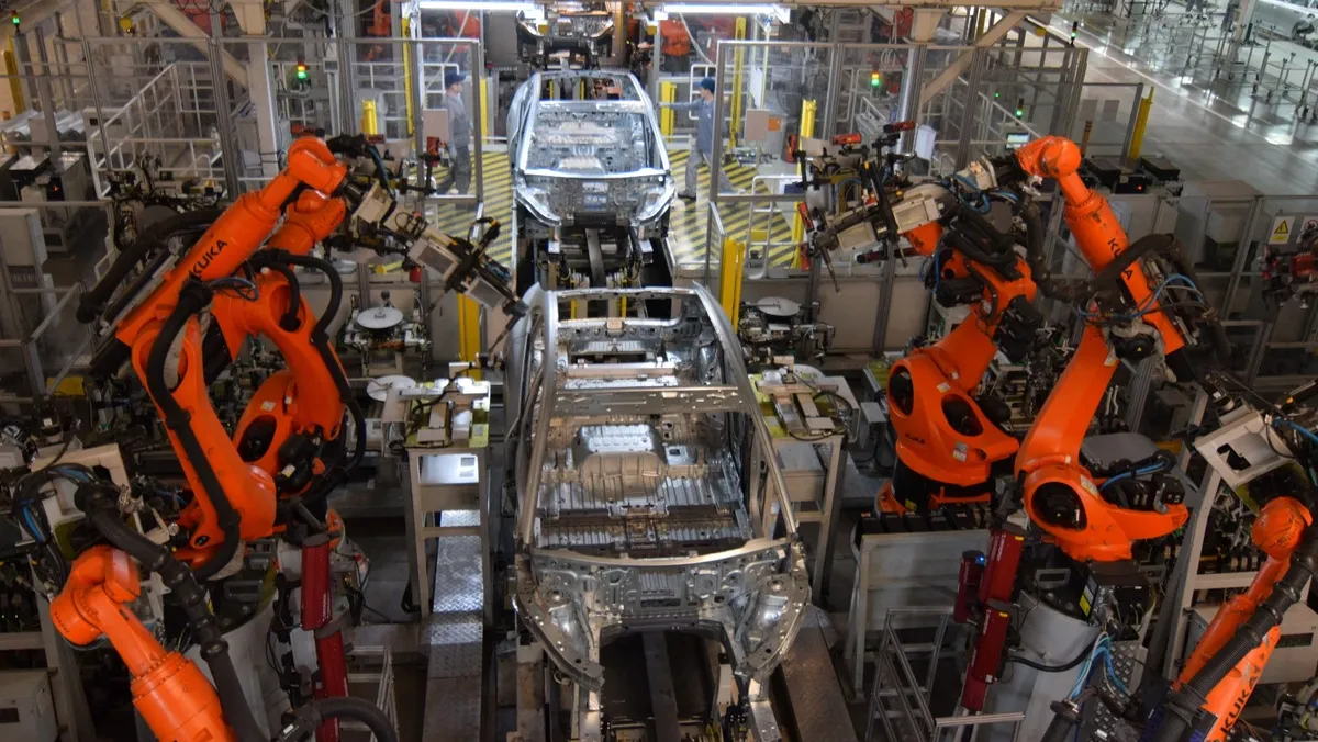 روبوتات تقوم ببناء مركبات على خط إنتاج في مصنع تجميع سيارات تابع لشركة Nio في الصين. 25 أبريل 2025 - Reuters