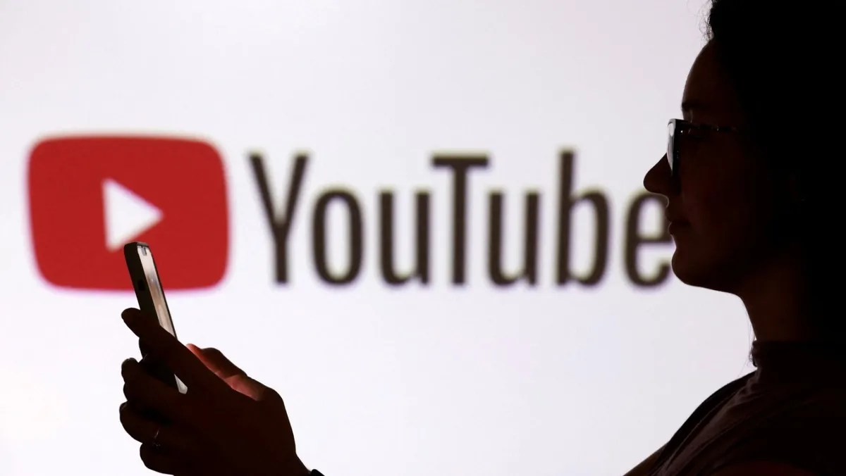 فتاة تحمل هاتفاً ذكياً أمام شعار يوتيوب. 11 سبتمبر 2025 - Reuters