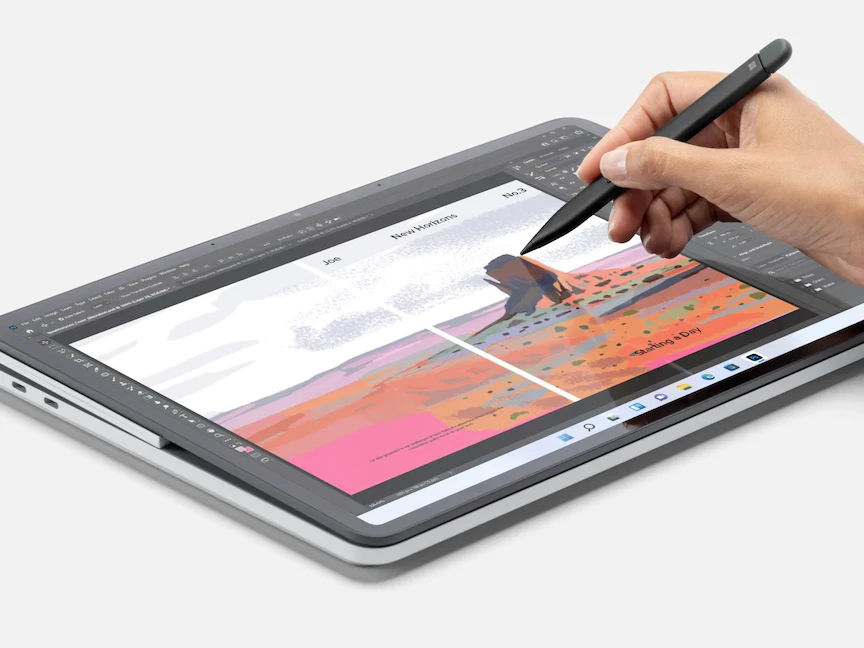 ولكي تقدم مايكروسوفت مزيجاً من تجربة لابتوب سيرفيس برو وأجهزتها المميزة سيرفيس استوديو، قامت الشركة بتقديم التصميم المميز الشاشة القابلة لتحويل وضعيتها، بالإضافة إلى دعم تشغيل قلم الشركة الذكي الجديد Surface Slim Pen 2، إلى جانب دعم تثبيته وفي جانب الجهاز وشحنه مغناطيسياً.