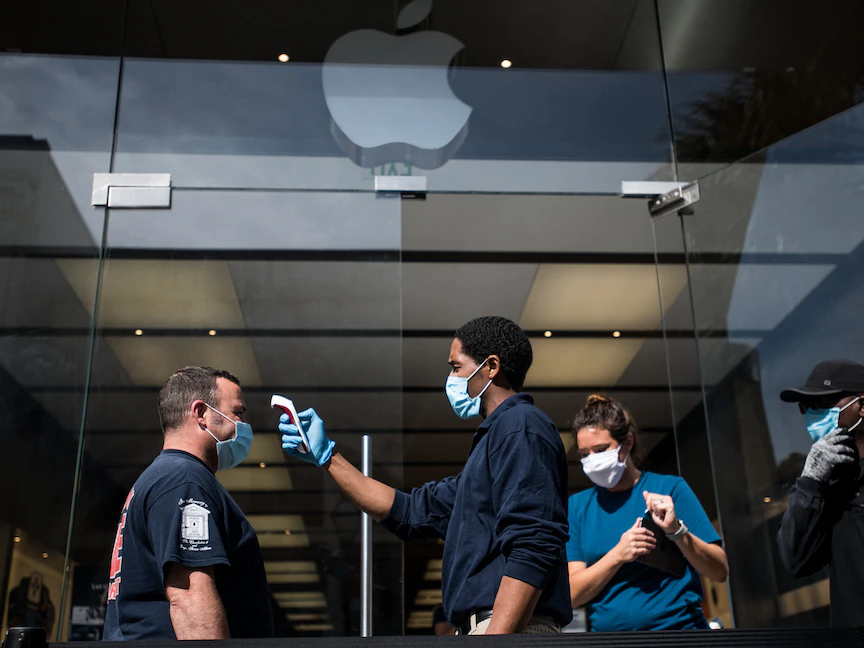 حارس أمن يتحقق من درجة حرارة العملاء خارج متجر أبل في تشارلستون بولاية ساوث كارولينا - 13 مايو 2020 - Getty Images via AFP