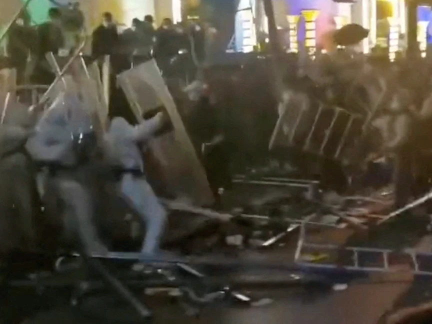 عمال في مصنع لهواتف "آيفون" في الصين يشتبكون مع شرطة مكافحة الشغب، مصنع فوكسكون، تشنغتشو، الصين - 23 نوفمبر 2022 - via REUTERS