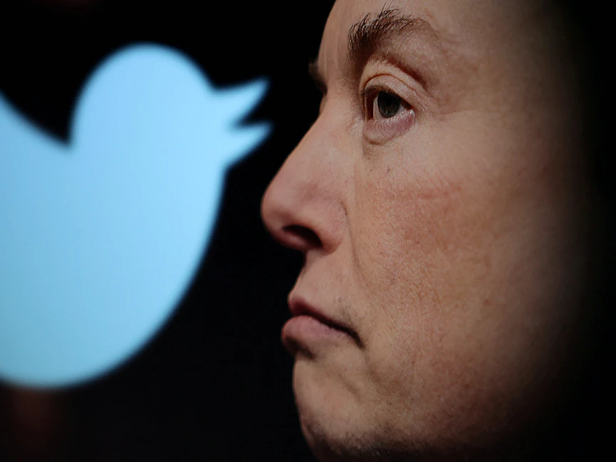 رسم توضيحي يحمل صورة إيلون ماسك وشعار تويتر في الخلفية- 27 أكتوبر 2022 - REUTERS