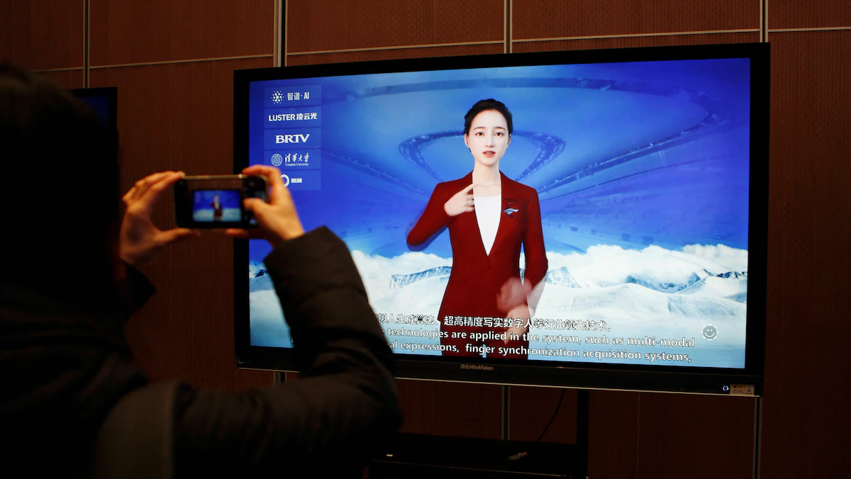 صحافي يصور شاشة تعرض نظام لغة إشارة رقمية مدفوعاً بنظام الذكاء الاصطناعي في أكاديمية بكين للذكاء الاصطناعي. 10 فبراير 2022 - REUTERS