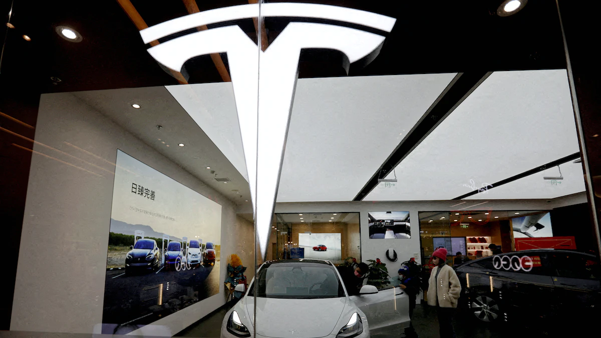 علامة تسلا التجارية بأحد معارض سياراتها في بكين. 4 فبراير 2023 - REUTERS