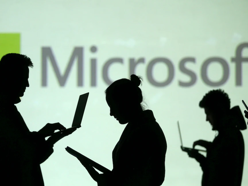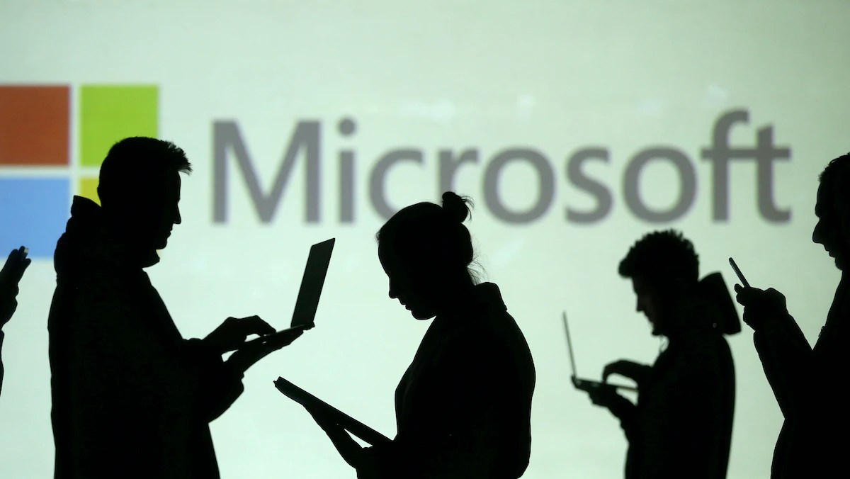 صورة توضيحية لأشخاص يحملون حواسيب أمام شعار "مايكروسوفت" - REUTERS