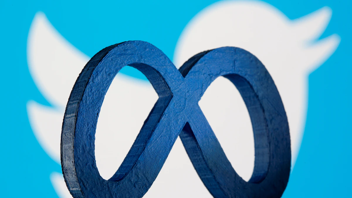 يظهر شعار Meta الجديد المطبوع ثلاثي الأبعاد أمام شعار Twitter المعروض في هذا الرسم التوضيحي. 2 نوفمبر 2021 - REUTERS